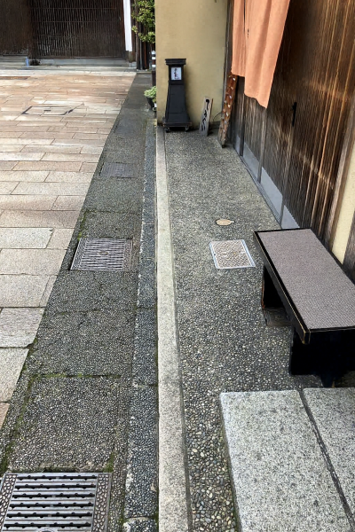 特に印象的だったのが、道路脇にある雨水排水溝のグレーチングでした。仕事柄、建築の細部にどうしても目が行ってしまいます(笑)。一般的な物とは異なり、中央に金沢市の市章が施されるなど、デザイン性の高さに驚きました。